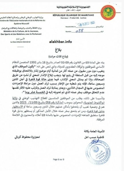 نواكشوط(وكالة السواحل للأنباء):وجهت وزارة التهذيب الوطني وإصلاح النظام التعليمي إنذارا لعشرات المدرسين، ومقدمي خدمة التعليم للالتحاق بأماكن عملهم خلال 72، وهددت بشطبهم من الإطار بسبب ترك العمل دون مراعاة الإجراءات المنصوص عليها في المجال التأديبي.