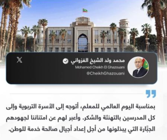 وعبر الرئيس ولد الشيخ الغزواني، في تغريدة نشرها في حسابه على منصة X، عن امتنان الدولة لهؤلاء على جهودهم التي وصفها بـ"الجبارة" من أجل اعداد "اجيال صالحة خدمة للوطن"