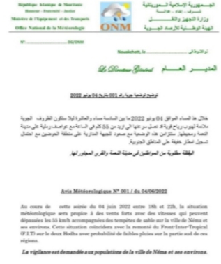 وكالة السواحل للانباء (نواكشوط):حذرت الهيئة الوطنية للأرصاد الجوية من رياح قوية قد تصل سرعتها 55 كلم للساعة، مع عواصف رملية مساء اليوم في مدينة النعمة عاصمة ولاية الحوض الشرقي ومحطيها.