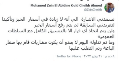 وشدد ولد الشيخ أحمد في تغريدة على حسابه في تويتر على أنه "لم يتم رفع أسعار الخبر، ولن يتم اتخاذ أي قرار إلا بالتنسيق الكامل مع السلطات العمومية".