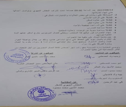 ووفق المحضر يتم إنهاء الإضراب فور توقيع المحضر ويعطي للعمال الموجدين خارج أماكن عملهم المدة الكافية لعودتهم.