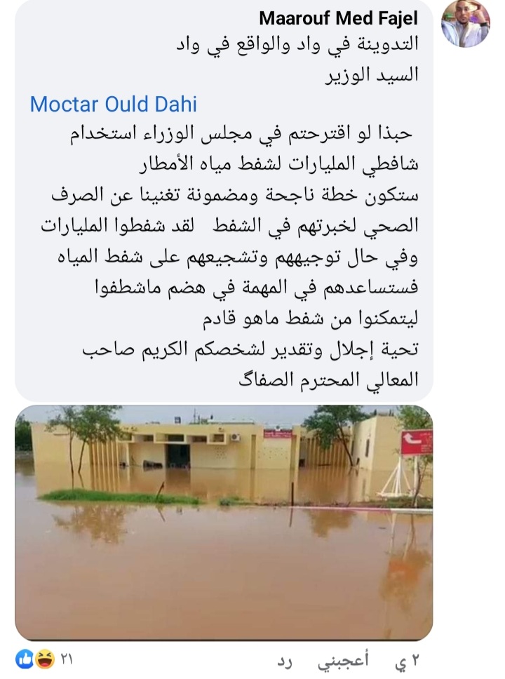 وكالة السواحل للانباء(نواكشوط): كتب وزير الصحة المختار ولد داهي عبر صفحته على فيسبوك عن الأمطار التي أدت إلى غمر مستشفى أكجوجت وقال الوزير ولد داهي: تداعيات أمطار خير اليوم على " مستشفى أكجوجت" إثر تهاطل أمطار خير وبركة صباح اليوم على مدينة أكجوجت غمرت مياه أجزاء من مستشفى أكجوجت و الحمد لله حتى كتابة هذه السطور:- - لا أضرار مطلقا على المحجوزين و المتعالجين والمراجعين؛ - تم تأمين التجهيزات الفنية و الطبية الحساسة؛ جار إعداد و تفويج و تنفيذ خطة لتعزيز قدرات المنظومة الصحية بأكجوحت بما يتطلبه الأمر من طواقم و سيارات إسعاف و "بنى تحتية" بديلة مؤقتة ريثما يتم شفط المياه... كل الشكر و الدعم للسلطات الإدارية و الطواقم الصحية و قدرات الدفاع المدني على التضحيات،... وهكذا علق الفسابكة والمهتمون على تدوينة الوزير، حيث كتب أحمد الشنقيطي: نتمنى أن تعاينوا مركز استطباب اكجوجت بشكل مباشر ثم تنشرون تدوينة عنه كما وجدتموه. أما المواطنة عيشة عبد الرحمن فكتبتب: نحن نباشر المستشفيات لأننا لانجد غيرها وأكثر اطلاعا عليها من معاليكم، ووضعيتها المزرية معروفة للجميع والافواج الذاهبة إلى دكار وتونس دليل آخر على الثقة المعدومة في مستشفياتنا، ونعرف أيضا أن الامر أكبر من معاليكم وأن المافيا المتنفذة في استيراد الادوية المغشوشة هي التي أسقطت الوزير نذيرو قبلكم، لكننا نريد منكم عدم الكذب فقط وألا تقولوا لنا شيئا نحن نعلم علم اليقين مناقضته للواقع. أما عبد الرحمن السالم فعلق بقوله: كفى المرء كذبا ان يحدث بكل ما سمع انتوم الا تتاصلو بشي من الكذابة يعطوكم شي من لمراد البعيدة من الواقع واتحدثو انتوم بيها المواطن على اساس انها حقيقة مطلقة. وتعليقا على خطة إنقاذ بديلة اقترحها أحد المعلقين كتبت عيشة بنت حمادي: لكانت عندهم خطة اعود عدلوه لين ارفدهم السيل 2019 اثلت سنوات ماتغير ش جاهم املي 2022ورفدهم فيما كتب المواطن محمد الغيث حمادة: وزير الصحة عليكم بالصدق هههه هذا الي كالك ذي لخبار اثرو ماه فأكجوجت الا اثرك اقلطت و اتواصل امع اهل أمورج أما المواطن معروف محمد فاجل فكتب: التدوينة في واد والواقع في واد السيد الوزير Moctar Ould Dahi حبذا لو اقترحتم في مجلس الوزراء استخدام شافطي المليارات لشفط مياه الأمطار ستكون خطة ناجحة ومضمونة تغنينا عن الصرف الصحي لخبرتهم في الشفط لقد شفطوا المليارات وفي حال توجيههم وتشجيعهم على شفط المياه فستساعدهم في المهمة في هضم ماشطفوا ليتمكنوا من شفط ماهو قادم تحية إجلال وتقدير لشخصكم الكريم صاحب المعالي المحترم الصفاگ أما المواطن طلحة عبد الرحمن فقد علق بنشر فيديو لسيدة قيل إنها تعرضت للإهمال أثناء التصفية في أحد مستشفيات نواكشوط ما تسبب في فقدانها الكثير من الدم وكتب طلحة معلقا: تداعيات الاهمال والتلاعب بارواح الضعفاء .. عندما تم تعيينك اتضح انهم يخططون لمجزرة كبري