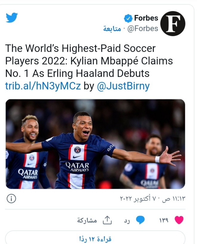 وكان ميسي ورونالدو قد بلغا الثلاثين من العمر عندما تخطى كل منهما حاجز الدخل السنوي البالغ 100 مليون دولار لأول مرة في عام 2018. بيد أن مبابي، بلغ هذا الرقم وهو في الثالثة والعشرين من عمره فقط.