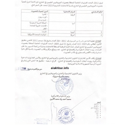 وكالة السواحل للانباء(نواكشوط):وقع وزيرا الداخلية واللا مركزية محمد أحمد ولد ولد محمد الأمين، والخارجية محمد سالم ولد مرزوك مقررا مشتركا حددا بموجبه ثماني دول في أربع قارات، يحق للجاليات الموريتانية فيها التصويت في الانتخابات القادمة.