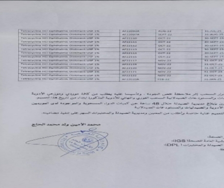 وكالة السواحل للانباء(نواكشوط): دعت وزارة الصحة إلى سحب لعينات من TETRACYCLINE HYDROCHLORIDE OPHTHALMIC OINTMENT USP 1% إثر ملاحظة نقص في جوجتها.