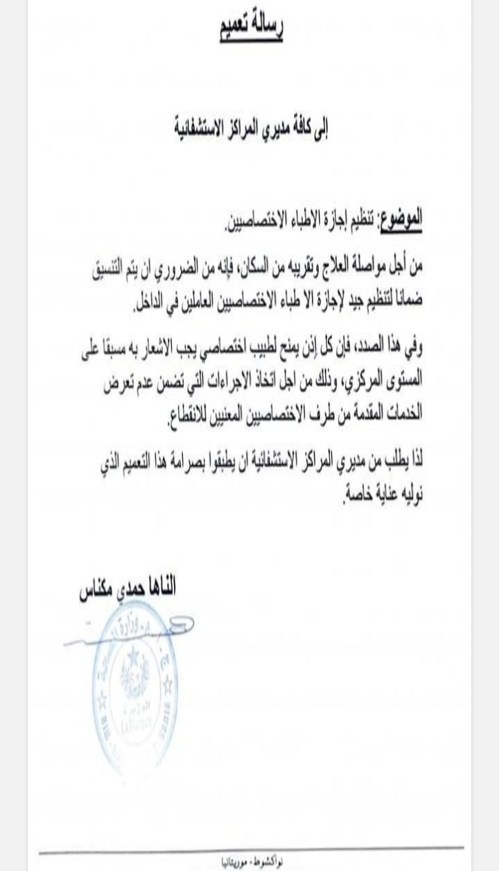 نواكشوط(وكالة السواحل للأنباء):اصدرت مساء اليوم السبت وزيرة الصحة الناها حمدي مكناس تعميما إلى كافة مديري المراكز الاستشفائية، بشأن تنظيم إجازة الأطباء الأختصاصيين، من أجل مواصلة العلاج وتقريبه من السكان، وضمان تنظيم جبد لإجازة الأطباء الاختصاصيين العاملين في الداخل.