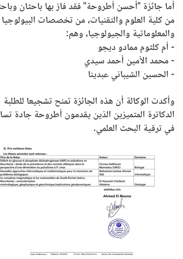 نواكشوط(وكالة السواحل للأنباء):أعلنت الوكالة الوطنية للبحث العلمي والابتكار اليوم أسماء الفائزين في مسابقة "جوائز لتميز"، وتمويل مشاريع البحث العلمي، والتي تولت لجنة منتدبة من الوكالة الإشراف على اختيارهم.