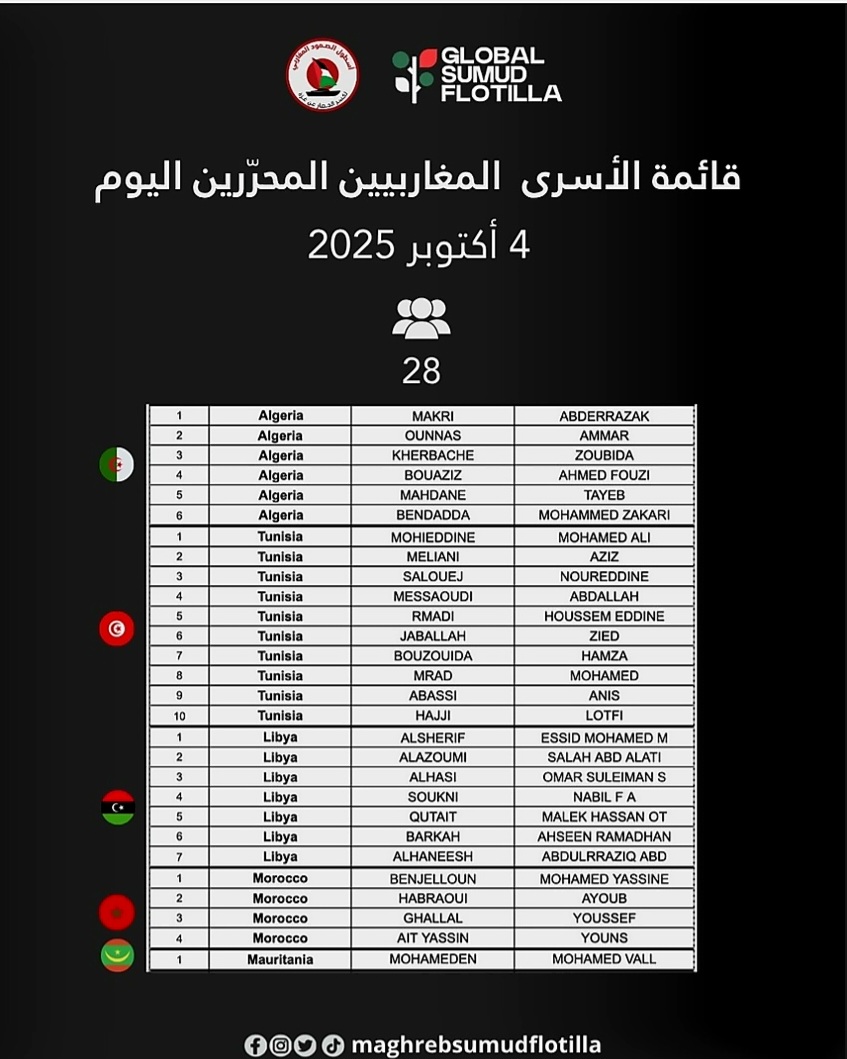 وقال "أسطول الصمود المغاربي" إن بين هؤلاء المحررين 28 مواطنا مغاربيا، 10 من تونس و6 من الجزائر، و4 من المغرب، و7 ليبيين، وموريتانيا واحدا.