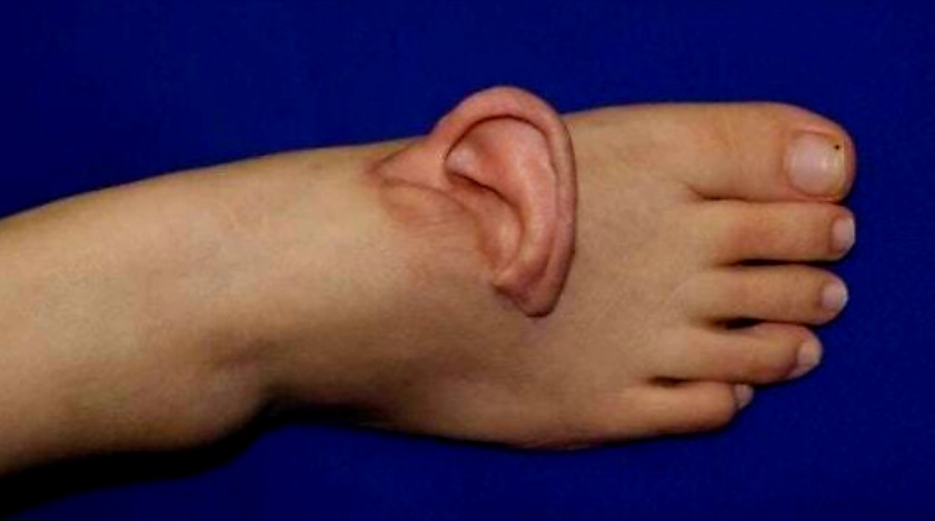 وتم اختيار أعلى القدم كمكان لزرع الأذن، نظرا لاستقرار الدورة الدموية في تلك المنطقة، ورقة الجلد التي تسهل الوصلات الوعائية الدقيقة، اضافة إلى تشابه حجم الأوعية الدموية مع أوعية الاذن.