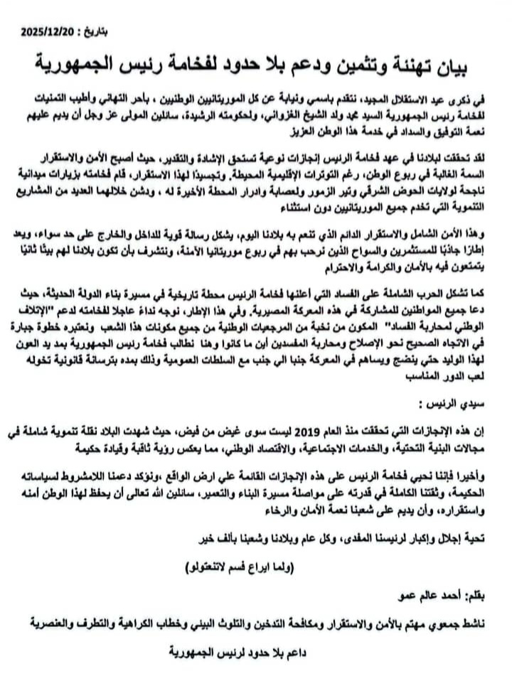 وجه الناشط الجمعوى،احمدعالم عم برسالة تهنئة وشكر للرئيس ولد الغزوانى بمناسبة الذكرى ال65 لعيد الاستقلال الوطنى.