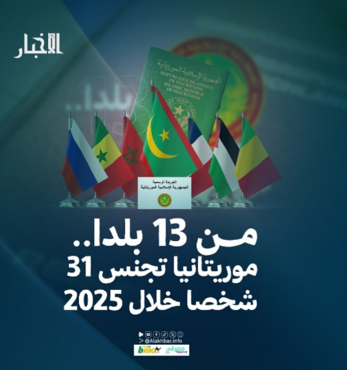 منح الرئيس الموريتاني الجنسية الوطنية لـ31 شخصا خلال العام 2025،وهو عمل غريب ورقم قياسي مقارنة مع الأعوام السابقة،وصل عدد الحاصلين على الجنسية الموريتانية لا يتجاوز عدة افراد.