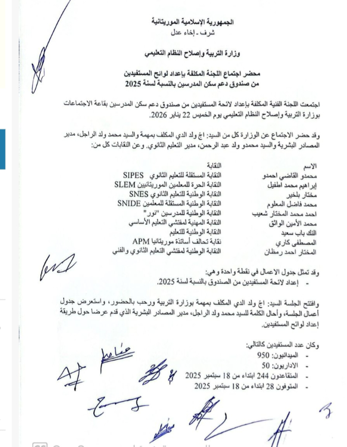 واستند ممثلوا النقابات في ذلك على منطوق المادتين 31 و 32 من المقرر المشترك رقم 1359 بتاريخ 10 نوفمبر 2025 المحدد للإجراءات العملية لتسيير ومتابعة صندوق دعم سكن المدرسين.