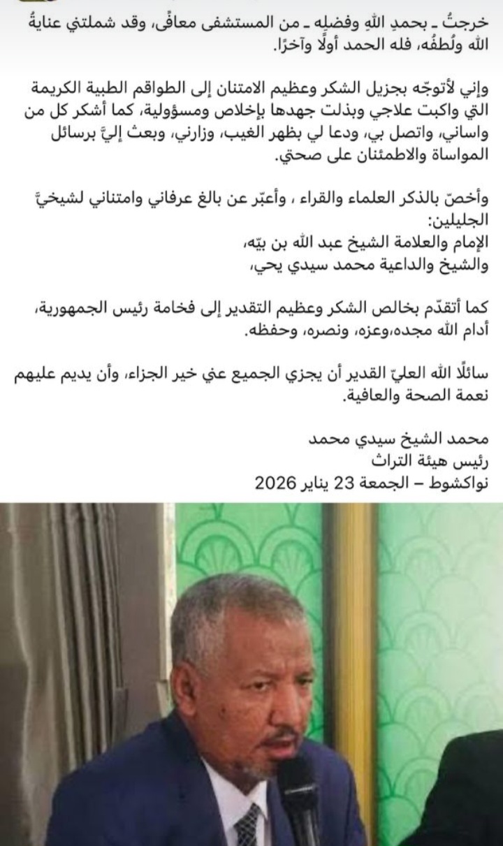 علمت وكالة السواحل للأنباء بخروج الاستاذ محمد الشيخ ولد سيدى محمد من المستشفى بصحة جيدة ولله الحمد⁹.