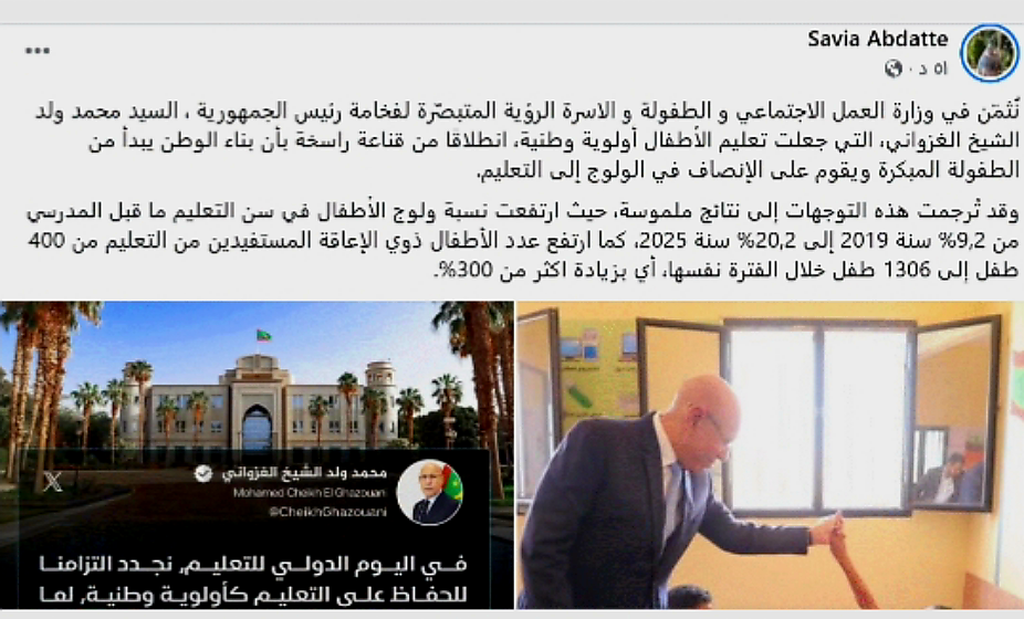 وأشارت الوزيرة بنت انتهاه في منشورها إلى أن نسبة ولوج الأطفال في سن التعليم ما قبل المدرسي ارتفعت من 9,2% سنة 2019 إلى 20,2% سنة 2025.