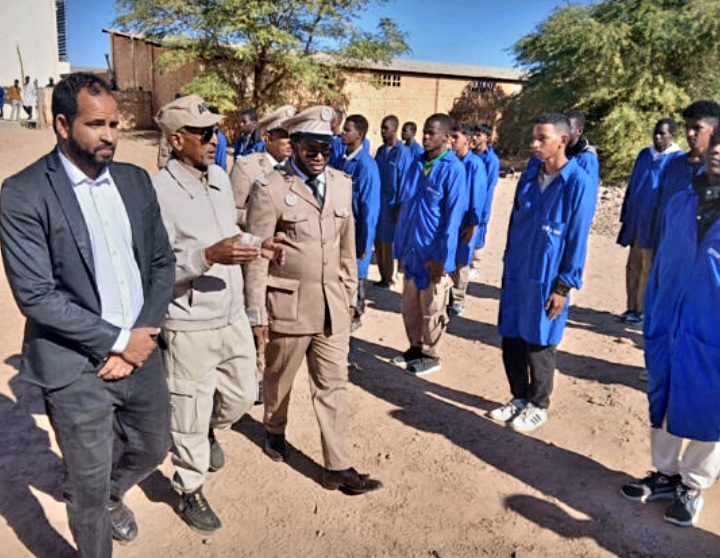 أشرف بوبكر ولد محمد والي آدرار المساعد، صحبة العقيد محمد الأمين ألمين، قائد المنطقة العسكرية الثالثة، صباح اليوم الجمعة، على اختتام المرحلة الأولى من برنامج التكوين شبه العسكري لصالح 250 من تلاميذ السنة الأولى بمدرسة التعليم الفني والتكوين المهني في أطار.