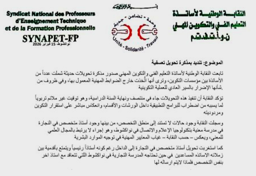 واعتبرت النقابة أن التحويلات اتُّخذت خارج الضوابط المهنية، وفي توقيت غير ملائم تربوياً، لما قد يسببه ذلك من اضطراب في البرامج التطبيقية داخل الورشات والأقسام، وانعكاسات مباشرة على استقرار التكوين ومردوديته.