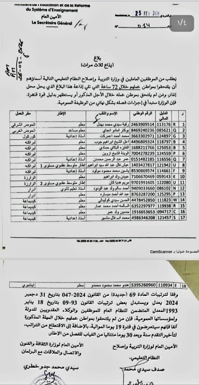 دعت وزارة التربية 17 موظفا الى الالتحاق بعملهم،ولوحت بفصلهم من القطاع إذا لم يلتحقوا بمقار عملهم خلال 72 ساعة.