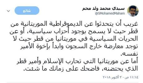 استغرب الاستاذ سيدي محمد ولد محم رئيس الحزب الحاكم في موريتانيا هجوم القطريين على التجرية الديموقراطية في موريتانيا حيث أوضح ان دولة مثل قطر حيث حيث يوجد إخوة الأمير في السجون لمعارضتهم إياهم مثل باقي المعارضين ليس من حقها ان تهاجم دولا ديموقراطية تضمن حرية التعبير لمواطنيها بكل حرية