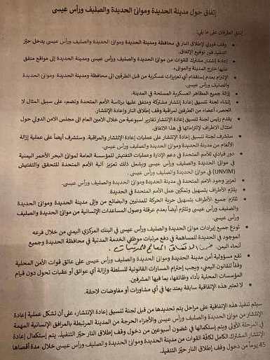هذا ونصّ اتفاق الأطراف اليمنية في مباحثات ستوكهولم على وقف فوري لإطلاق النار في مدينة الحديدة وموانئها والصليف ورأس عيسى.