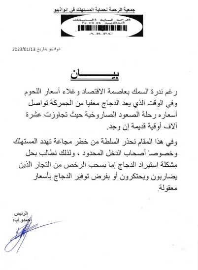 وكالة السواحل للأنباء(نواكشوط):حذرت جمعية الرحمة لحماية المستهلك بمدينة نواذيبو السلطات المحلية مما سمته خطر مجاعة تهدد المستهلكين بسبب ندرة السمك ، وغلاء أسعار اللحوم.