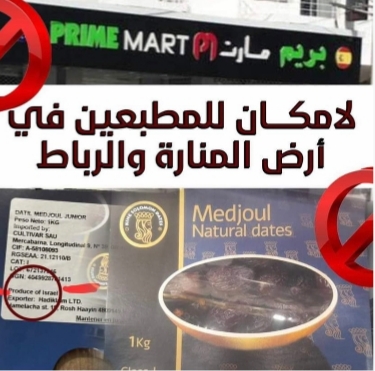 وكالة السواحل للأنباء(نواكشوط):طالبت المبادرة الطلابية لمناهضة لاختراق الصهيوني وللدفاع عن القضايا العادلة، السلطات بالمصادرة "الفورية" لنوعية من التمور تحمل شارة التصنيع في دولة "الكيان الصهيوني" وتعرض بأحد المجمعات التجارية بنواكشوط.