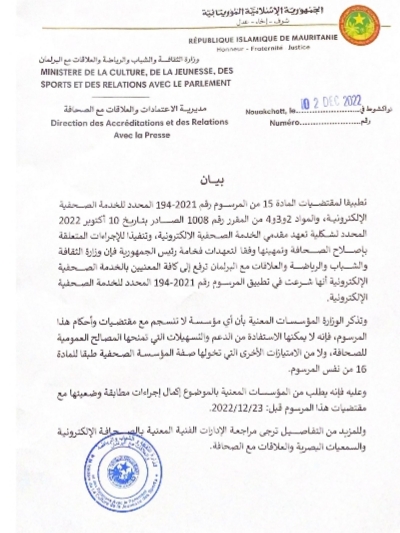 وكالة السواحل للأنباء(نواكشوط): دعا معالي وزير الثقافة والشباب والرياضة والعلاقات مع البرلمان، السيد محمد ولد اسويدات القائمين على سلطة الاشهار إلى مضاعفة الجهود والعمل على تفعيل هذا المرفق الحيوي ضمانا لتسريع وتيرة برنامج فخامة رئيس الجمهورية، السيد محمد ولد الشيخ الغزواني.