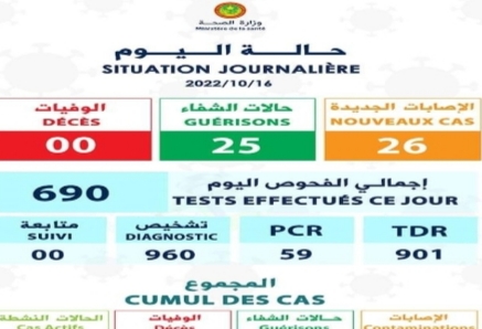 وكالة السواحل للأنباء(نواكشوط):اعلنت وزارة الصحة مساء اليوم عدم تسجيل حالة وفاة جديدة بفيروس كورونا فيما سجلت 26 إصابة بالفيروس التاجي و 25 حالة شفاء، وذلك خلال ال 24 ساعة الأخيرة.