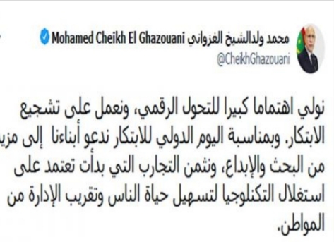 وكالة السواحل للأنباء(نواكشوط):دعا فخامة رئيس الجمهورية السيد محمد ولد الشيخ الغزواني، اليوم الخميس بمناسبة اليوم الدولي للابتكار، أبناء موريتانيا إلى المزيد من البحث والإبداع، مثمنا التجارب التي بدأت تعتمد على استغلال التكنلوجيا لتسهيل حياة الناس وتقريب الإدارة من المواطن.