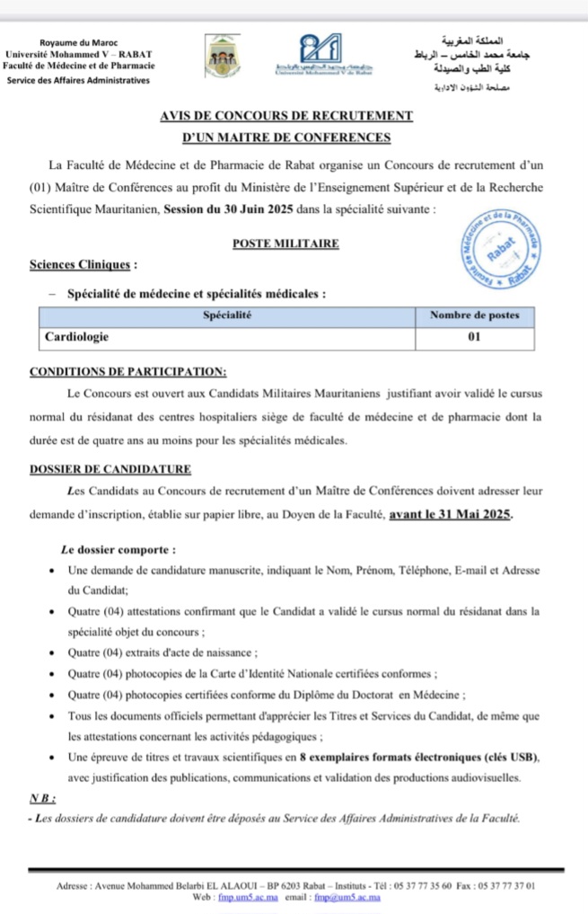 أعلن عن طريق كلية الطب والصيدلة بجامعة محمد الخامس بالمملكة المغربية عن مسابقة لتوظيف أستاذ محاضر واحد، لصالح وزارة التعليم العالي والبحث العلمي الموريتانية، في تخصص أمراض القلب.