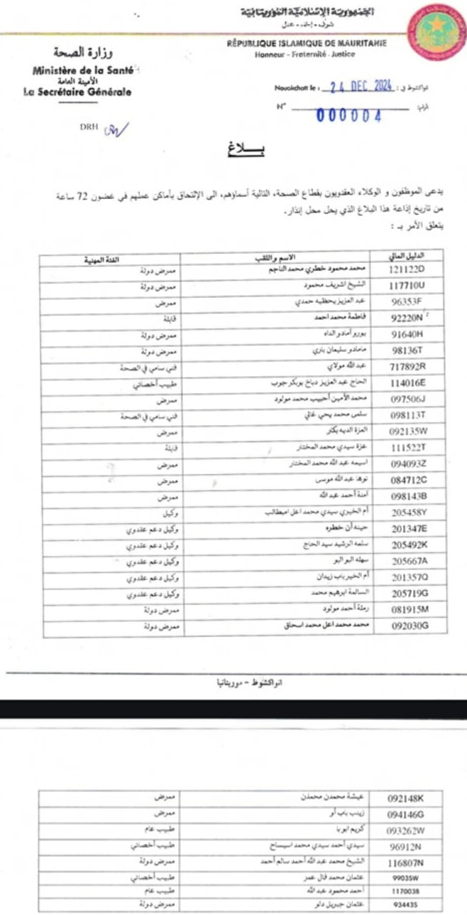 ودعت وزارة الصحة المعنيين للالتحاق بعملهم في ظرف 72 ساعة.