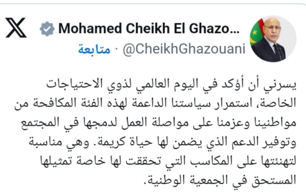ولد الغزواني في حسابه على أكس، أكد على “استمرار سياستنا الداعمة لهذه الفئة المكافحة من مواطنينا وعزمنا على مواصلة العمل لدمجها في المجتمع”.