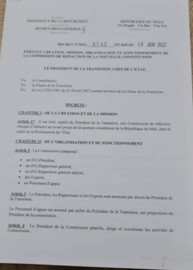 وكالة السواحل للانباء(نواكشوط): أعلن مرسوم صادر عن الرئاسة المالية عن تشكيل لجنة تعنى بكتابة مشروع أولي لدستور جديد للبلاد في غضون شهرين، وذلك أياما بعد إعلان المجلس العسكري الانتقالي عن فترة انتقالية من 24 شهرا، قبل إجراء الانتخابات وتسليم السلطة للمدنيين.