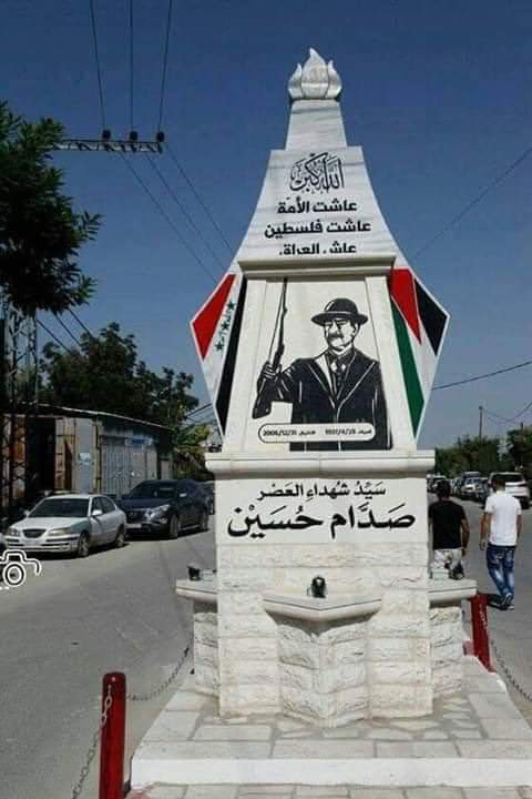 لمايمثله الشهيد القائد صدام حسين في قلوب ابناء الامة العربية والفلسطينيين خاصة وفي هذه الظروف الحالكة التى لا يستذكر فيها الا ابطال الامة نصب الفلسطينيون تمثالا للقائد المجهاد الشهيد فة قلب الضفة