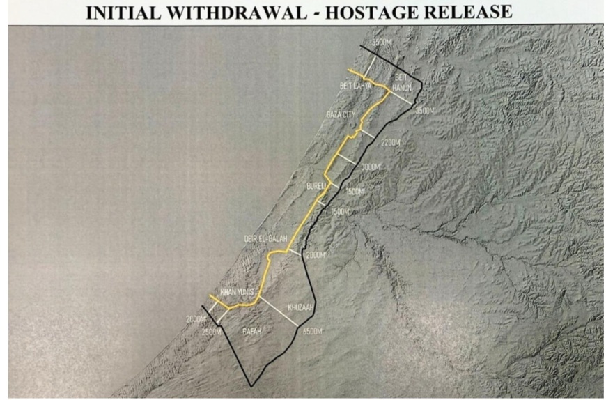 أظهرت خريطة كشف عنها الرئيس الأمريكي دونالد ترامب خط الانسحاب الأولي لقوات الجيش الصهيوني من قطاع غزة، في إطار المرحلة الأولى لتنفيذ عملية تبادل الأسرى والمحتجزين.