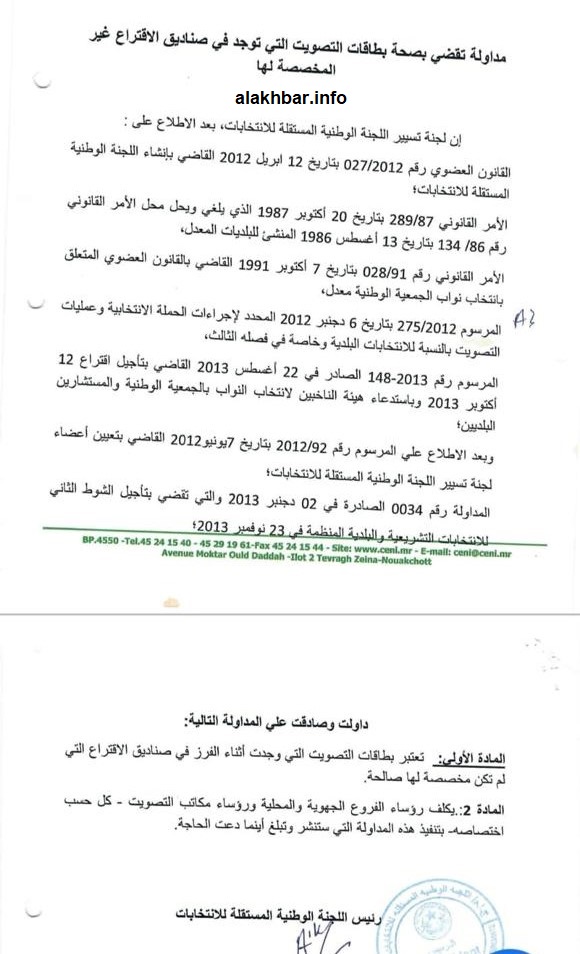 وكالة السواحل للأنباء(نواكشوط): أقرت اللجنة الوطنية المستقلة للانتخابات صحة بطاقة التصويت التي توضع في صندوق غير صندوقها في الاقتراع المقرر السبت القادم.