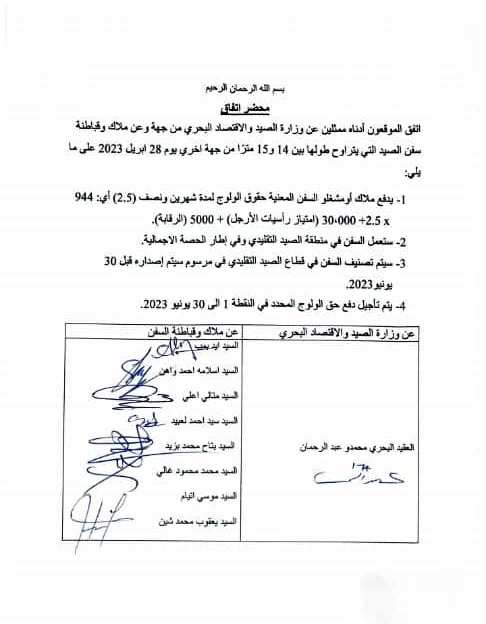 ووفق مسودة الاتفاق التي وقعها عن الوزارة العقيد البحري محمدو عبد الرحمن وعن الصيادين ملاك وقباطنة السفن فإنه الطرفان اتفقا على :