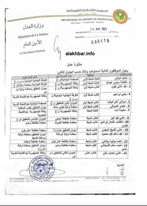 وكالة السواحل للانباء(نواكشوط): وقع الأمين العام لوزارة العدل محمد أحمد عيده مذكرة عمل حول بموجبها 14 كاتب ضبط، 6 منهم كانوا يعلمون في ولاية نواكشوط الغربية، إلى مناطق مختلفة من البلاد.