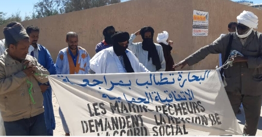 وكالة السواحل للانباء(نواكشوط): نظمت مجموعة من البحارة امس الإثنين وقفة احتجاجية أمام مبنى الولاية للمطالبة بمراجعة الاتفاقية الجماعية.