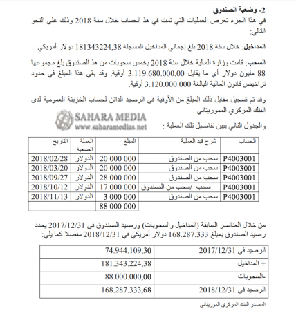 وكالة السواحل للانباء-نواكشوط:كشفت محكمة الحسابات الموريتانية، عن الوضعية المالية للصندوق الوطني لعائدات المحروقات (صندوق الأجيال)، خلال سنة 2018، وقالت في تقرير مفصل أن وزارة المالية سحبت منه 88 مليون دولار طيلة ذلك العام، بينما وصل رصيده مع نهاية العام إلى 168,28 مليون دولار.