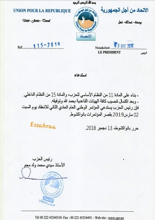 أصدر السيد رئيس حزب الاتحاد من أجل الجمهورية الحاكم الأستاذ سيدي محمد ولد محم اليوم الخميس استدعاء للمؤتمر الوطني العام العادي الثاني للانعقاد يوم السبت 02 مارس 2019 بالمركز الدولي للمؤتمرات (المرابطون) وفق ما جاء في رسالة استدعاء للحدث