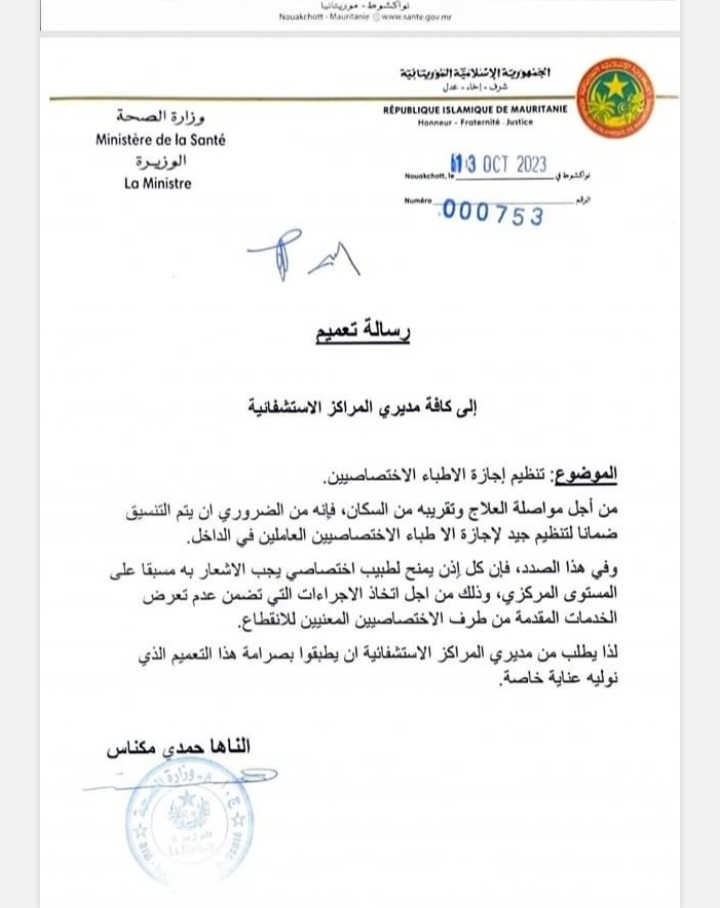 نواكشوط(وكالة السواحل للأنباء):اصدرت مساء اليوم السبت وزيرة الصحة الناها حمدي مكناس تعميما إلى كافة مديري المراكز الاستشفائية، بشأن تنظيم إجازة الأطباء الأختصاصيين، من أجل مواصلة العلاج وتقريبه من السكان، وضمان تنظيم جبد لإجازة الأطباء الاختصاصيين العاملين في الداخل.