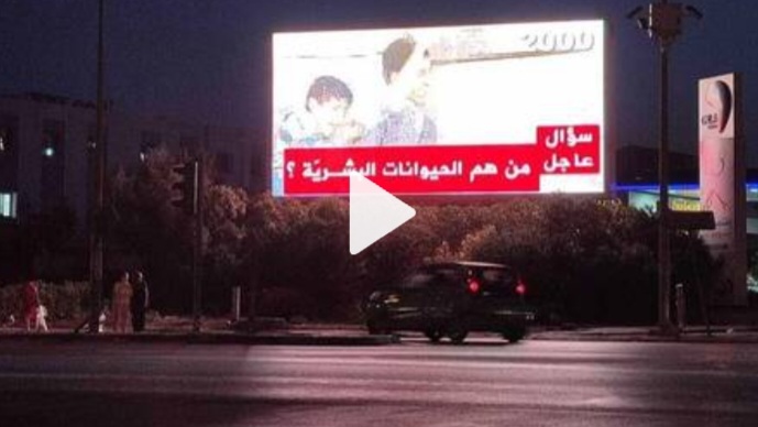 وأظهرت اللافتات صورا من معانات الشعب الفلسطيني طيلة عقود من الاحتلال الإسرائيلي مع سؤال عاجل: من هم الحيوانات البشرية؟