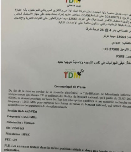وكالة السواحل للأنباء(نواكشوط):أعلنت شركة البث الإذاعي الموريتاني أنه سيتعين إجراء بحث جديد على أجهزة الاستقبال للعثور على تردد القنوات التلفزية والإذاعية الموريتانية، نظرا لبدء تشغيل منصة بث جديدة.
