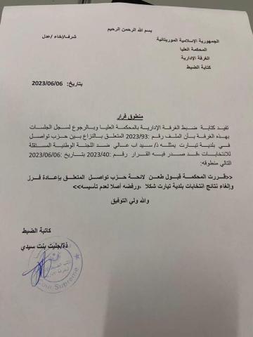وكالة السواحل للأنباء(نواكشوط): اصدرت الغرفة الادارية بالمحكمة العليا قرارا بقبول طعن مقدم من طرف حزب تواصل ضد نتائج انتخابات بلدية تيارت شكلا ورفضه اصلا ،وبررت المحكمة ،قرارها بعدم تأسيس طلب الطعن المقدم من طرف الحزب الخاسر.