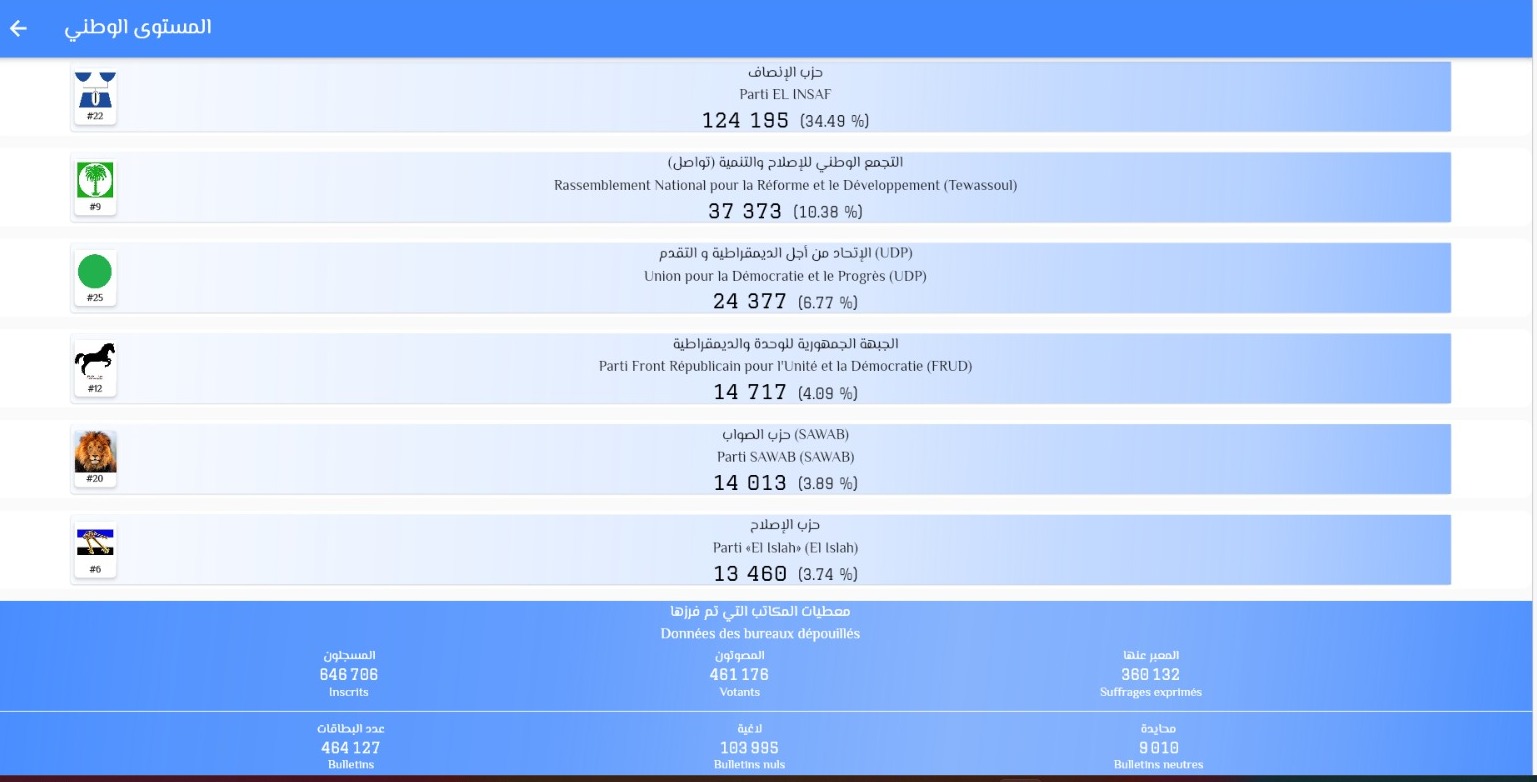 وكالة السواحل للأنباء(نواكشوط): أظهرت النتائج الأولية التي أعلنتها اللجنة الوطنية المستقلة للانتخابات أن اللوائح الوطنية جاءت في المرتبة الثانية بعد حزب الإنصاف الحاكم، متفوقة على 24 حزبا متنافسا على هذه اللوائح في جميع أنحاء البلاد، وذلك بعد فرز نحو 35% من أصوات الناخبين.