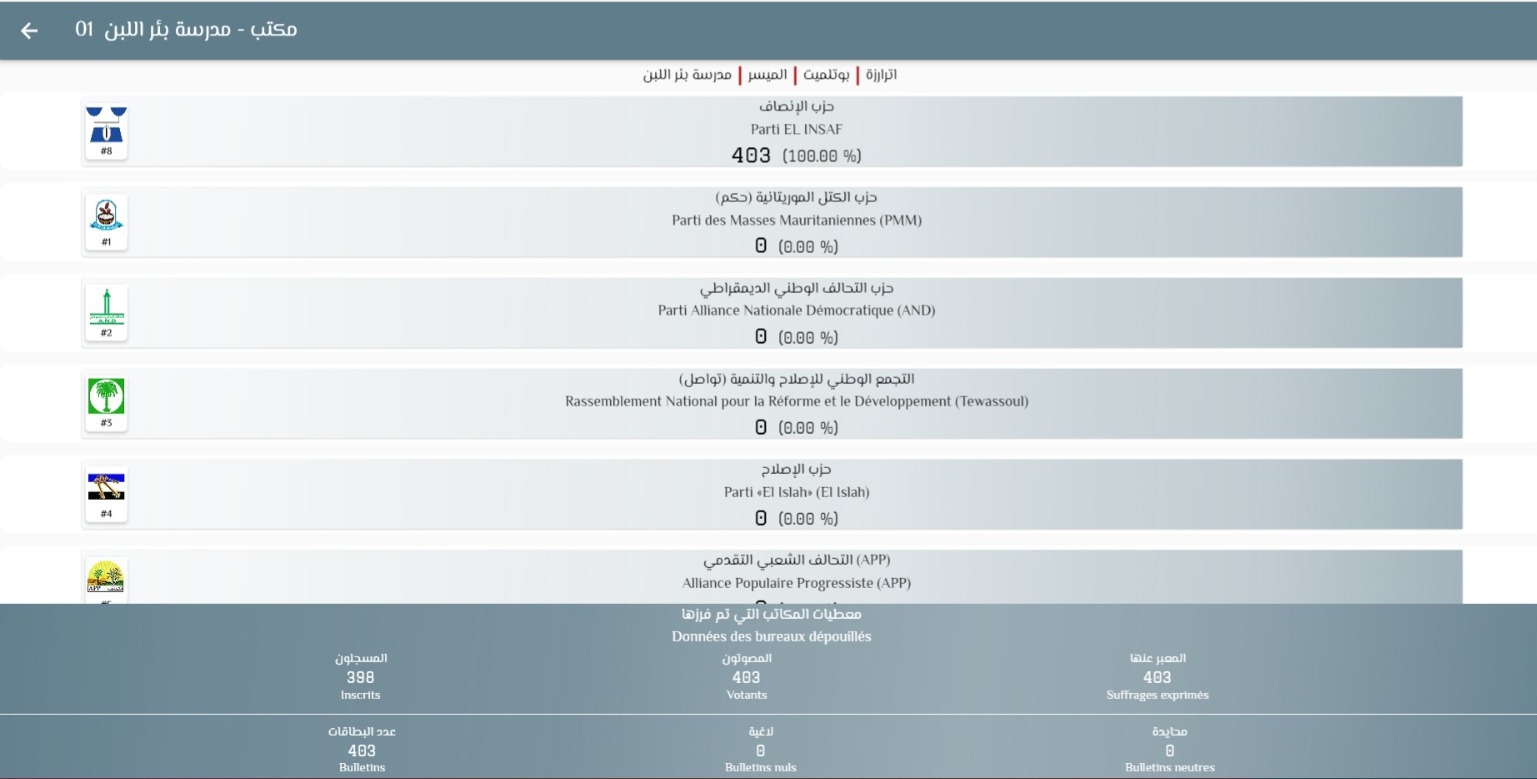 وكالة السواحل للأنباء(نواكشوط): ظهرت النتائج المعلنة من اللجنة الوطنية المستقلة للانتخابات تصويت عدد يفوق عدد المسجلين في مكتب التصويت رقم: 1 في مدرسة "ابير اللبن" التابعة لبلدية الميسر في مقاطعة بوتلميت، دون تسجيل أي بطاقة لاغية ولا محايدة.